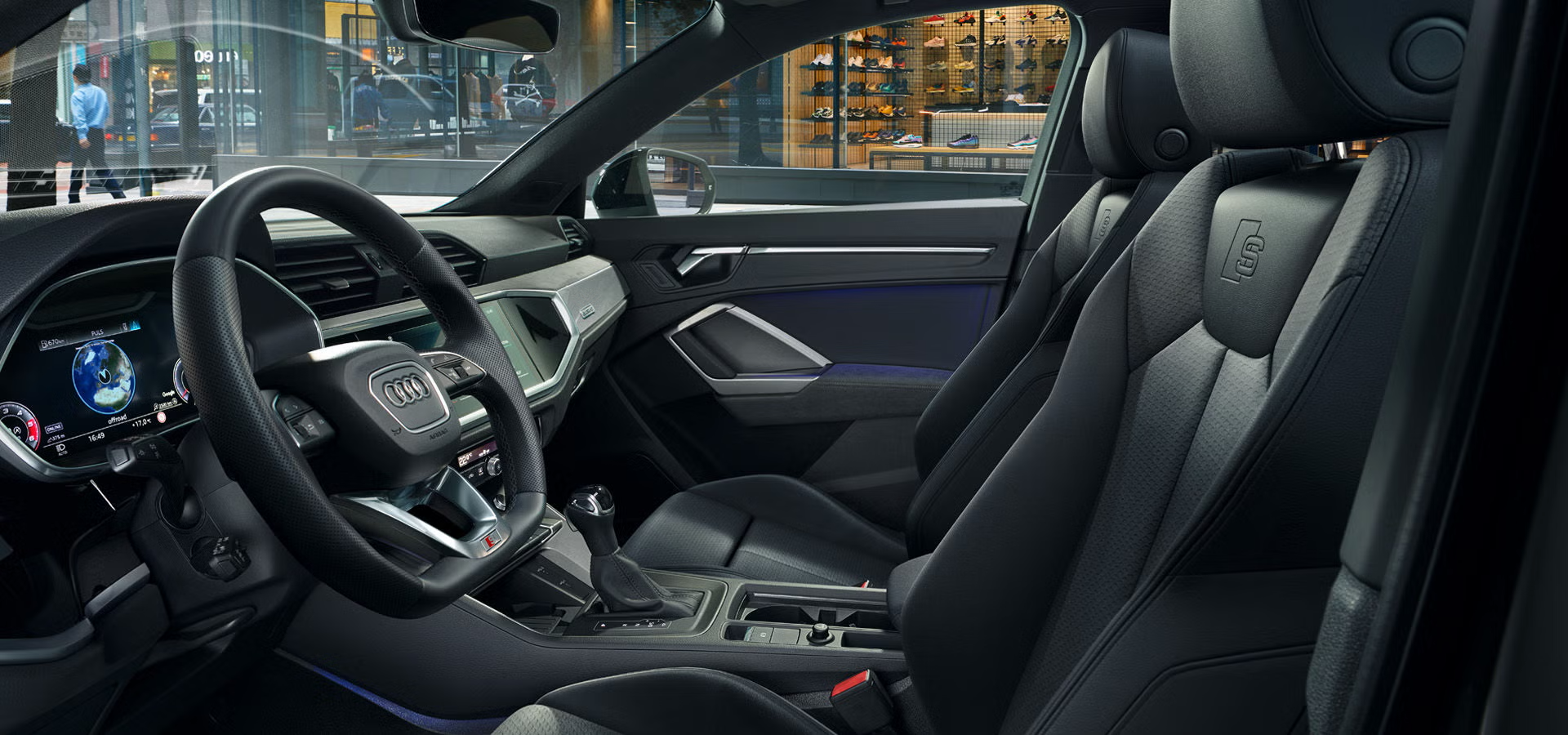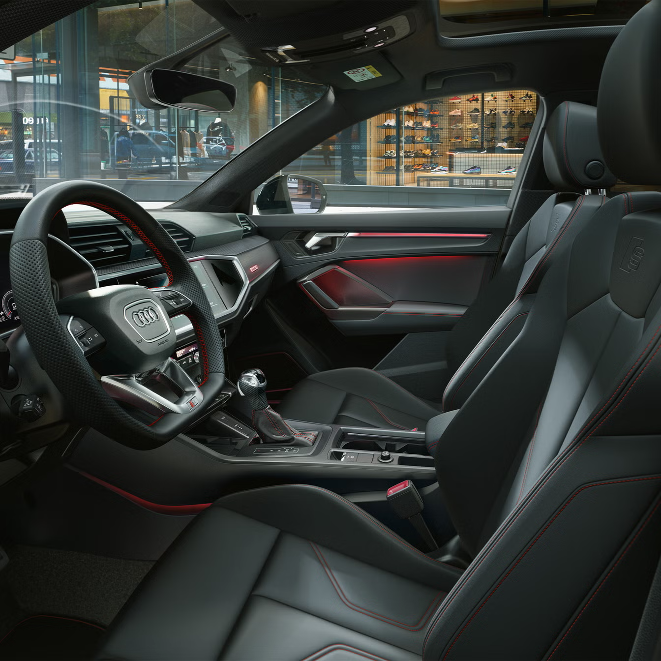 Hãy tạo thêm những điểm nhấn đặc sắc cho không gian nội thất với đường chỉ khâu màu đỏ từ Audi Sport GmbH: đường chỉ tương phản màu đỏ trên ghế và tựa tay cửa, tựa tay trung tâm tùy chọn, viền vô lăng, ốp cần số và trên thảm sàn màu đen với viền đen.