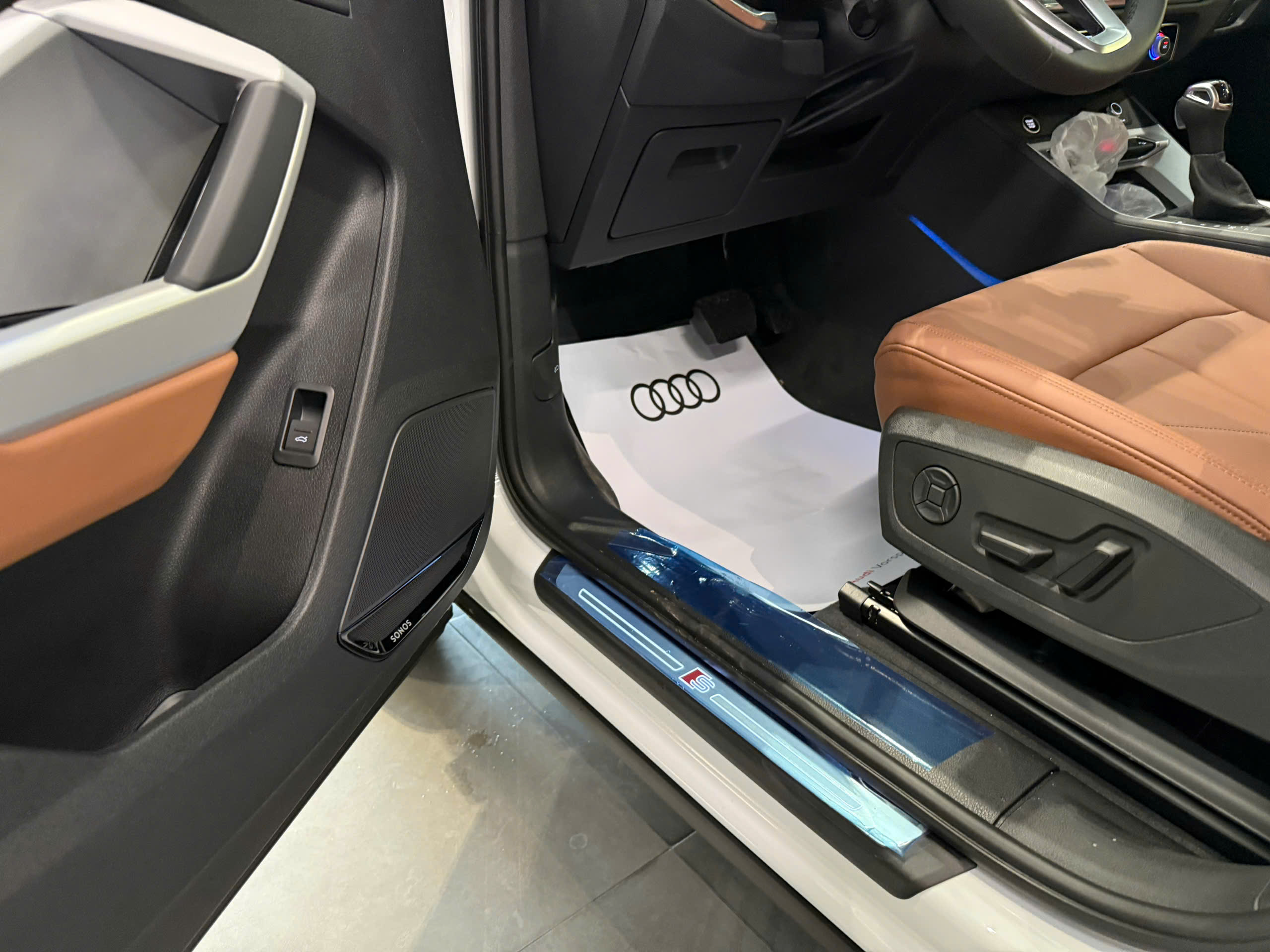 Hãy tạo thêm những điểm nhấn đặc sắc cho không gian nội thất với đường chỉ khâu màu đỏ từ Audi Sport GmbH: đường chỉ tương phản màu đỏ trên ghế và tựa tay cửa, tựa tay trung tâm tùy chọn, viền vô lăng, ốp cần số và trên thảm sàn màu đen với viền đen.