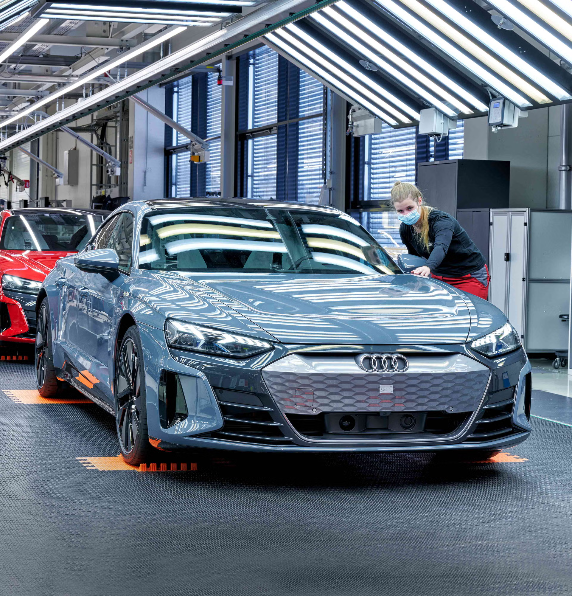 Trong quá trình sản xuất chiếc Gran Turismo chạy điện tại Böllinger Höfe gần Neckarsulm, sự tỉ mỉ đến từng chi tiết hòa quyện cùng độ chính xác và chất lượng tuyệt hảo.